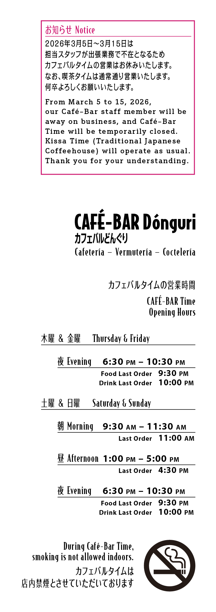 From March 5 to 15, 2026, our Café–Bar staff member will be away on business, and Café–Bar Time will be temporarily closed. Kissa Time (Traditional Japanese Coffeehouse) will operate as usual. Thank you for your understanding.